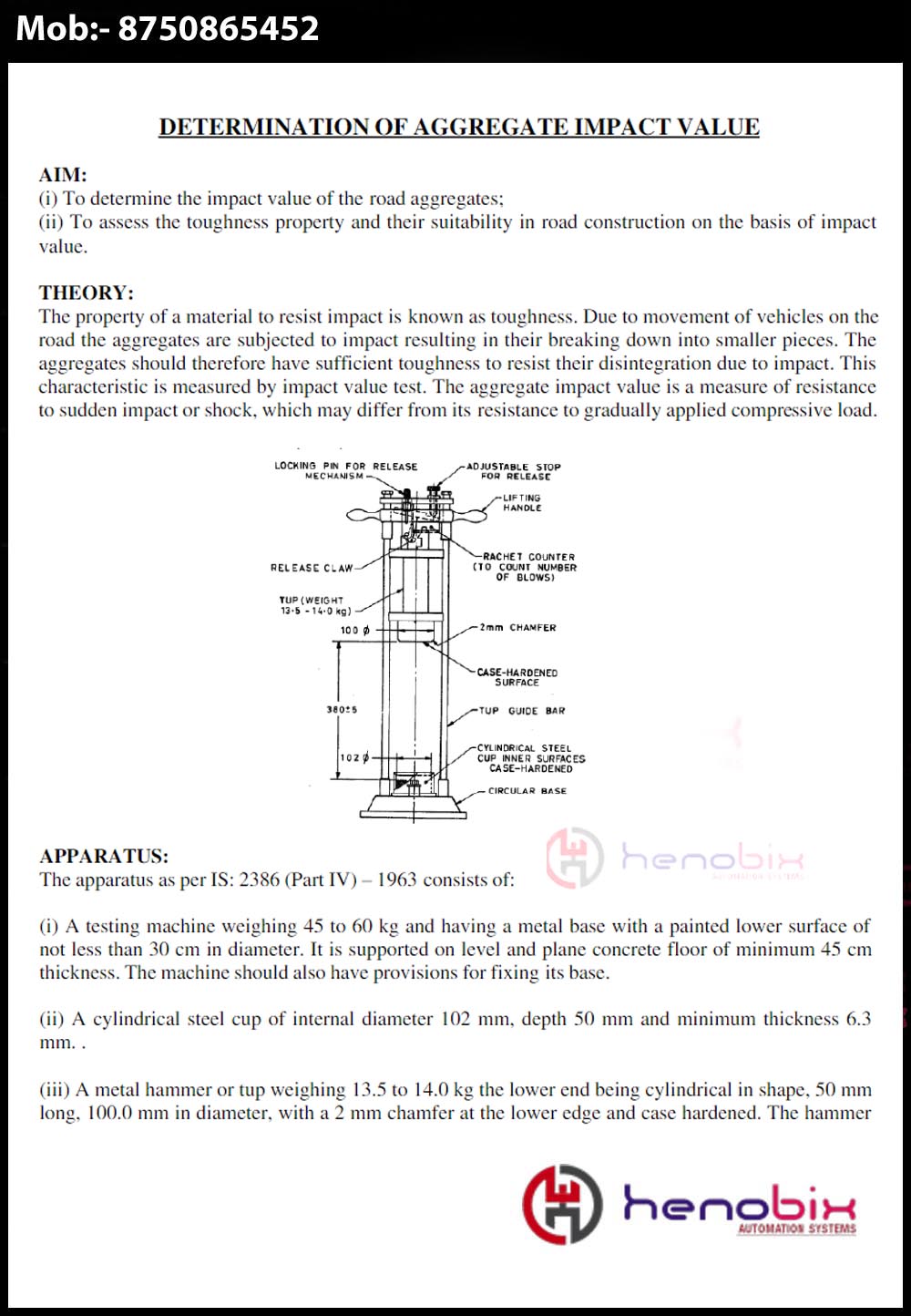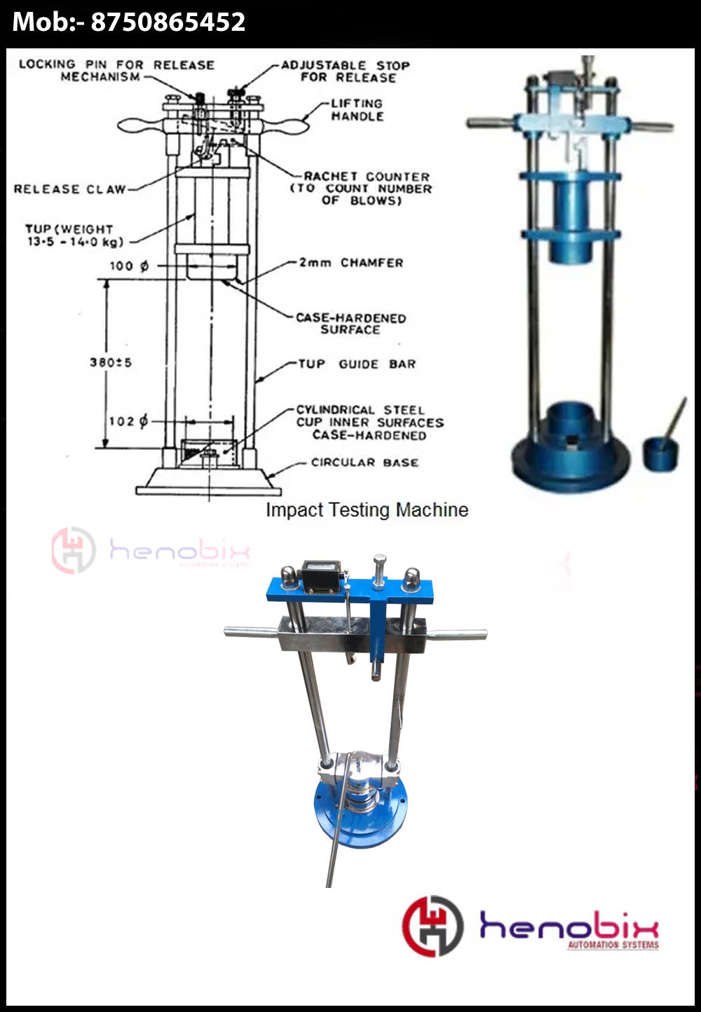 1.The Hammer of weight 13.75 +/-0.25kg can be raised to fall freely down the vertical guides. The Height of fall can be adjusted through 380 +/- 5mm. The Hammer is provided with a lockingarrangement.