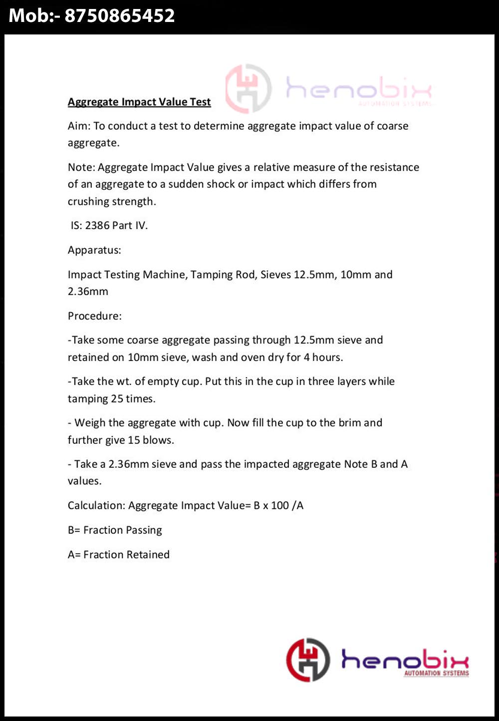 It is robustly designed to determine the aggregate impact value (AIV) of aggregates which provides a relative measure of the resistance of an aggregate to sudden shock or impact. The counter fitted to the machine automatically records the number of blows delivered to the sample, manufactured from heavy duty plated steel to resist corrosion..