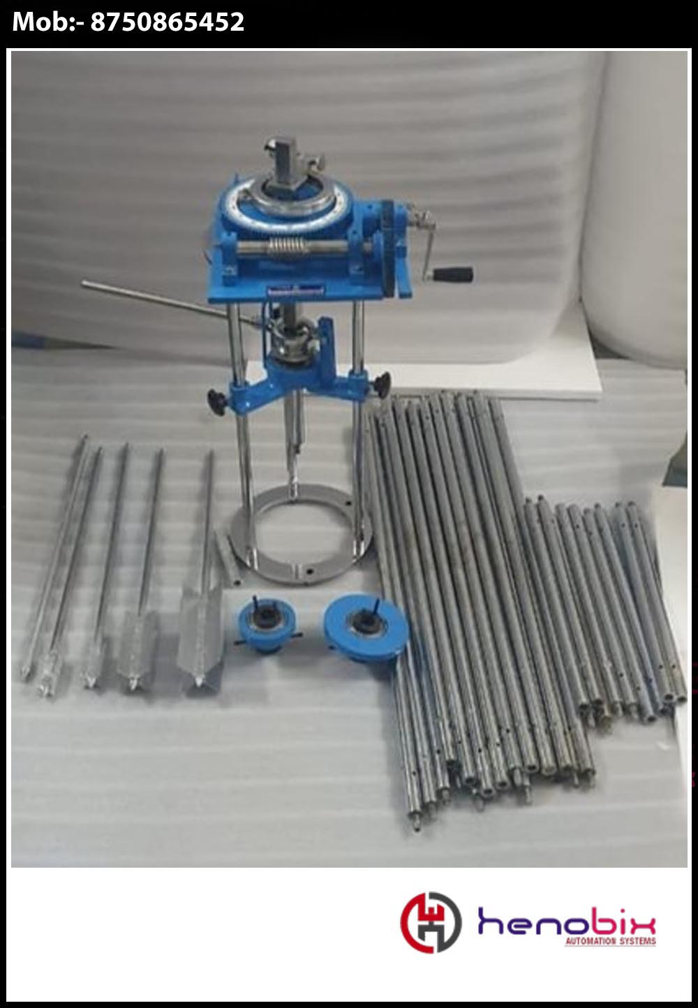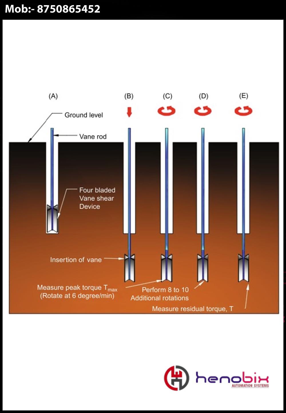 The equipment consists of a torque applicator assembly mounted on a base, a gear wheel, which is marked in degrees, holds a torque ring and is geared to a crank, the torque ring is a split ring & deforms as torque is applied & the deformation is indicated by a dial gauge. A calibration chart to convert dial gauge readings to torque force in kgs/cm2 is supplied. A pointer is provided. For registering the rotations of the vane, a detachable stand is provided to anchor the instrument an attachment to securely hold the string of rods is provided the equipment comprises of the following :