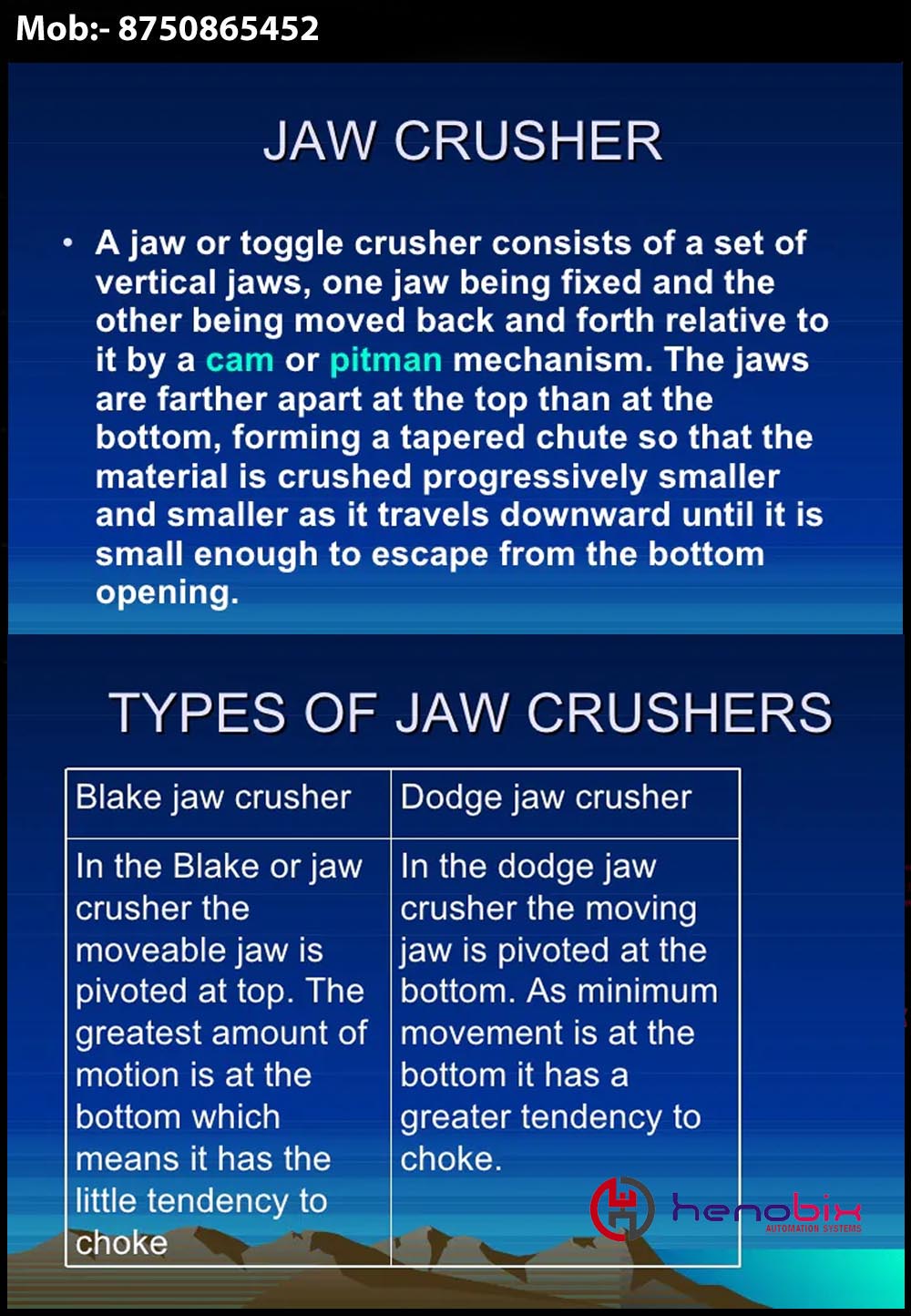 Jaw crusher is a compression type crusher, comprised of a fixed jaw and moving jaw positioned in a (V)..