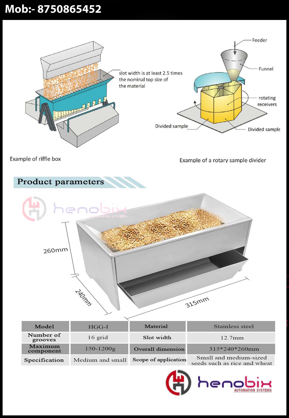 Riffle Sample Divider consists of a sheet metal box mounted on Legs and fitted with a series of chutes of equal width which discharge the material alternatively in Opposite Directions into separate pans..