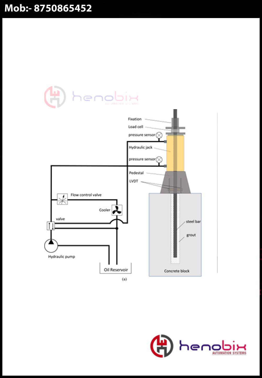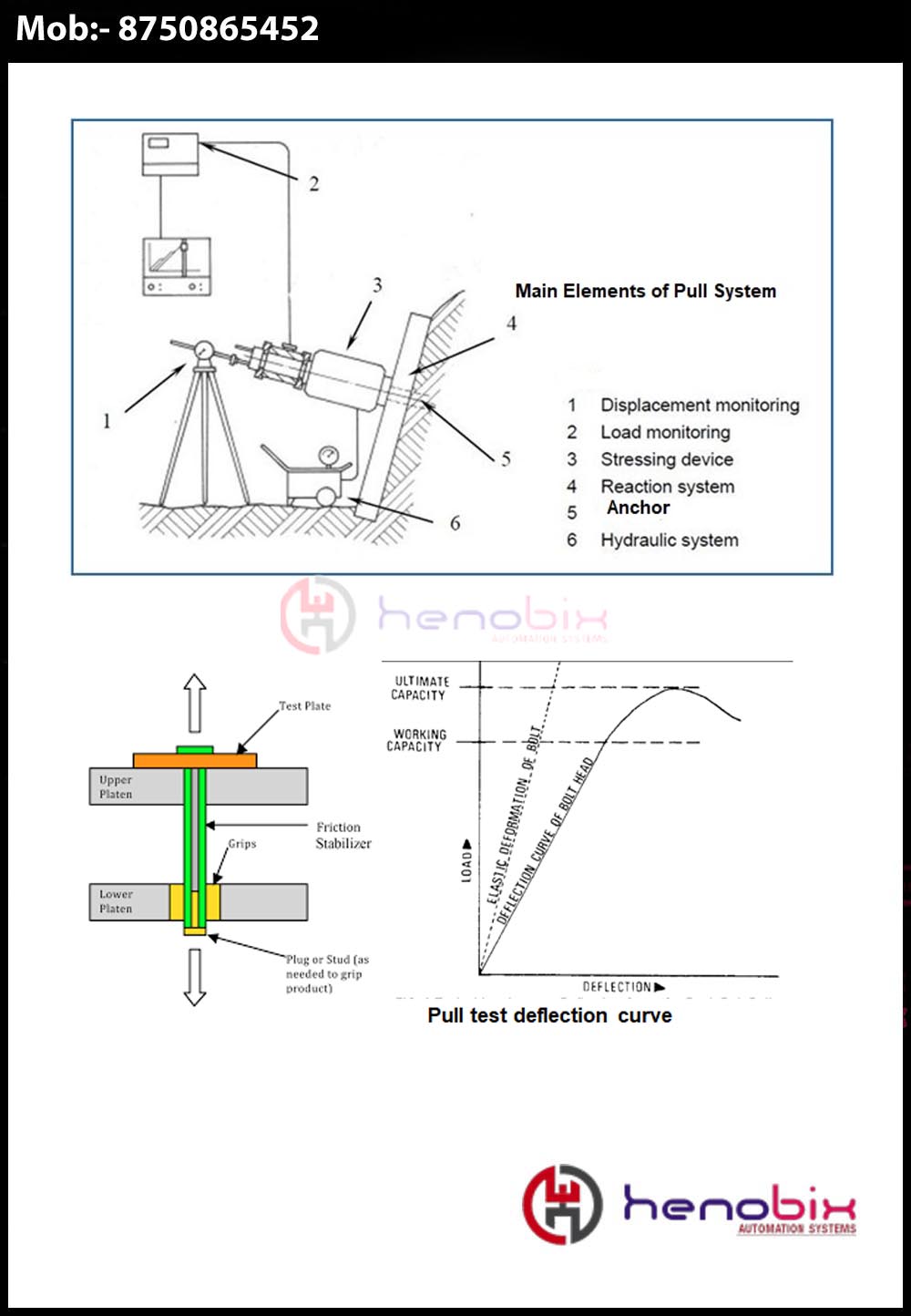 The objective of the test method is to measure the working and ultimate capacities of rock bolt anchors. The system comprises of a central hole jack, hand pump with a load gauge, directional control value (only for central hole jacks above the capacity of 500 kn), flexible hose pipe 5 mts, truss high tensile bolts with coupling. In general the pull out force is indicated on the load gauge, however a load cell with digital indicator can be used to measure the pull out load. .