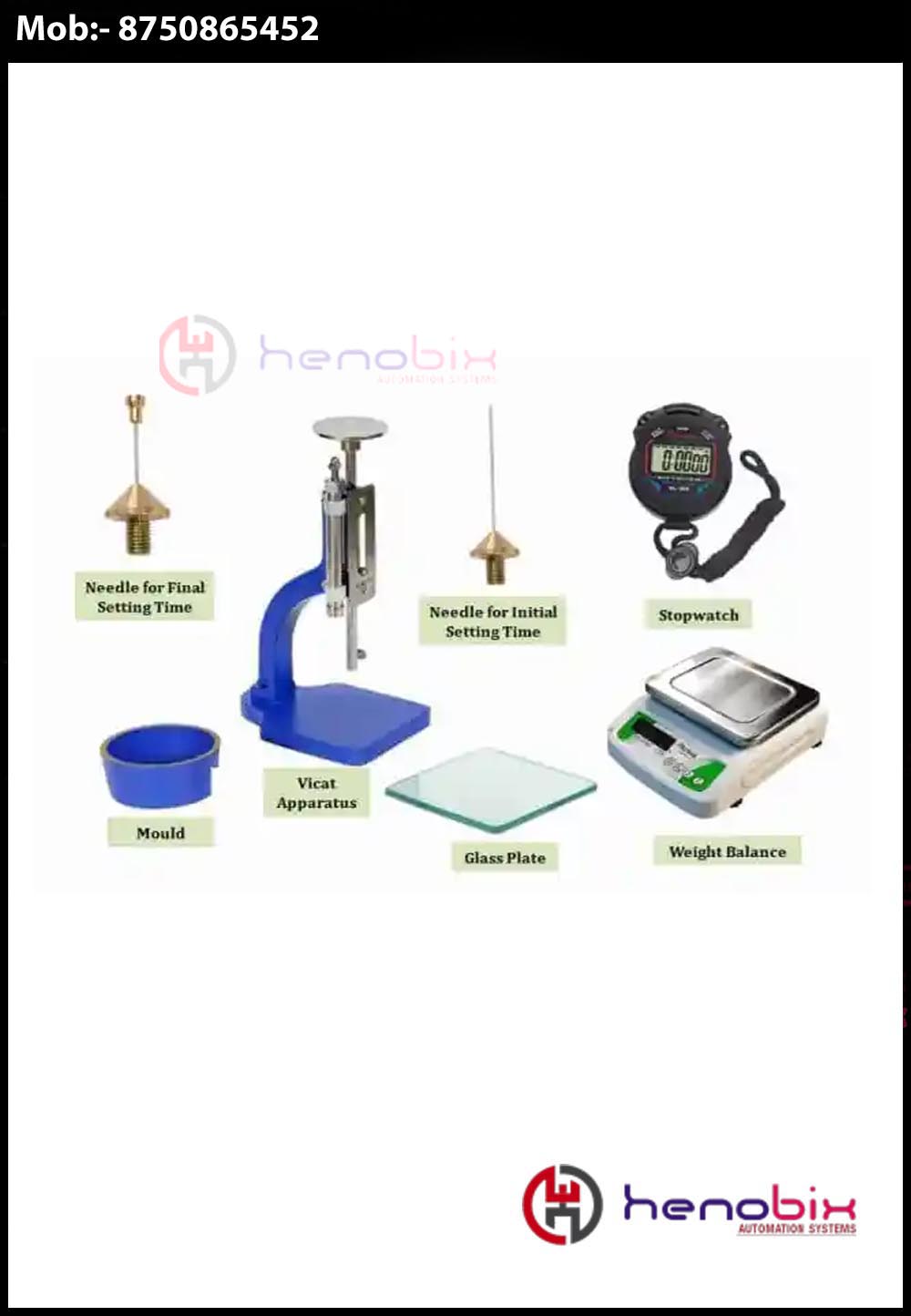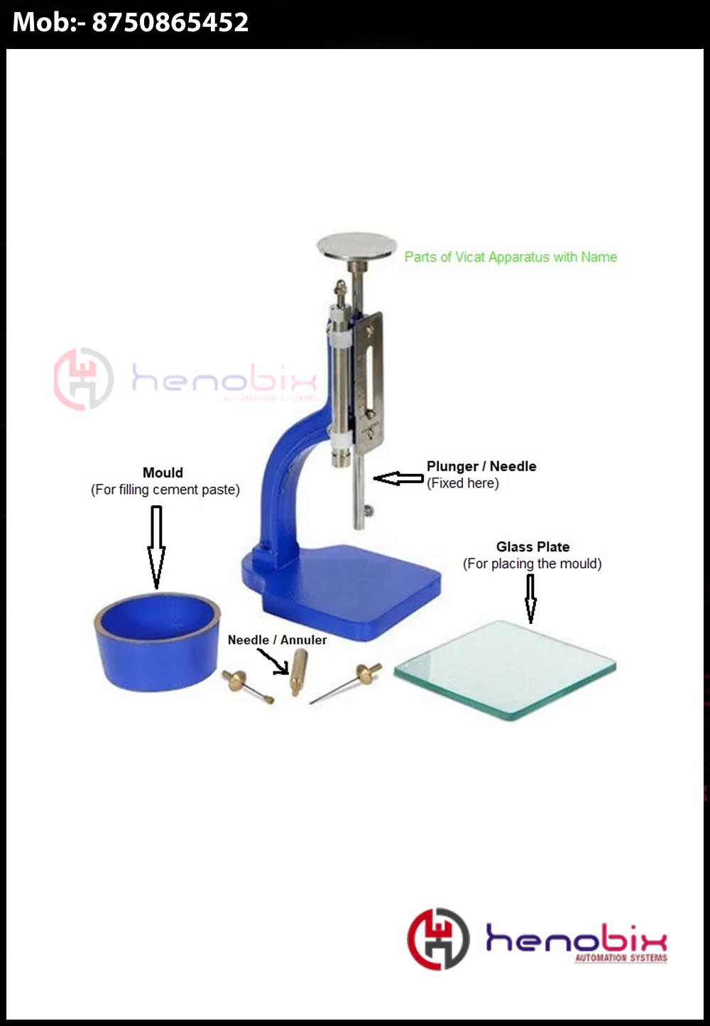 Vicate Neddle apparatus consists of a metallic frame bearing a freely movable and with a cap at the top, one vicat mould and glass base plate and one set of needles one each initial needle, final needle and consistency plunger. .